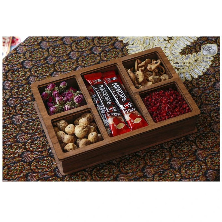 جعبه پذیرایی کد H212 ابزاری بسیار کاربردی برای پذیرایی از مهمان در منزل و محیط کار است که برای نگهداری انواع آجیل، دمنوشها و شکلات مورد استفاده قرار میگیرد. یکی از وسایل نفیسی که ظرافتهای آن هر بینندهای را به خود جذب میکند. همچنین جعبه پذیرایی را میتوانید به عنوان کادو یا هدایای تبلیغاتی به دوستان یا آشنایان خود اهدا کنید. اندازهی آن به گونهای است که به راحتی داخل کشو محل کار ، آشپزخانه و یا روی میز پذیرایی جای میگیرد و در زمانهای مختلفی میتوانید مواد داخل آن را مورد استفاده قرار دهید. این محصول دارای 5 قسمت می باشد که 4 قسمت آن ابعاد 75x75 میلی متر و یک قسمت آن ابعاد 160x75 میلی متر دارد. بدنه این محصول از جنس چوب دو طرف روکش شده با روکش فندقی می باشد و درب های قسمت های مختلف از جنس ورق اکریلیک شفاف می باشد که از نفوذ گرد و غبار جلوگیری می کند.