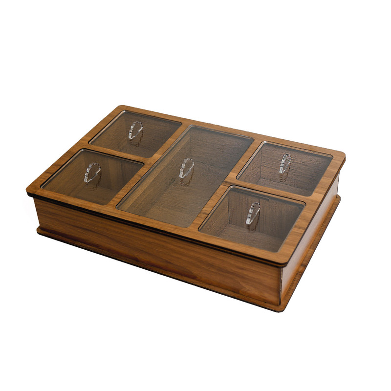 جعبه پذیرایی کد H212 ابزاری بسیار کاربردی برای پذیرایی از مهمان در منزل و محیط کار است که برای نگهداری انواع آجیل، دمنوشها و شکلات مورد استفاده قرار میگیرد. یکی از وسایل نفیسی که ظرافتهای آن هر بینندهای را به خود جذب میکند. همچنین جعبه پذیرایی را میتوانید به عنوان کادو یا هدایای تبلیغاتی به دوستان یا آشنایان خود اهدا کنید. اندازهی آن به گونهای است که به راحتی داخل کشو محل کار ، آشپزخانه و یا روی میز پذیرایی جای میگیرد و در زمانهای مختلفی میتوانید مواد داخل آن را مورد استفاده قرار دهید. این محصول دارای 5 قسمت می باشد که 4 قسمت آن ابعاد 75x75 میلی متر و یک قسمت آن ابعاد 160x75 میلی متر دارد. بدنه این محصول از جنس چوب دو طرف روکش شده با روکش فندقی می باشد و درب های قسمت های مختلف از جنس ورق اکریلیک شفاف می باشد که از نفوذ گرد و غبار جلوگیری می کند.